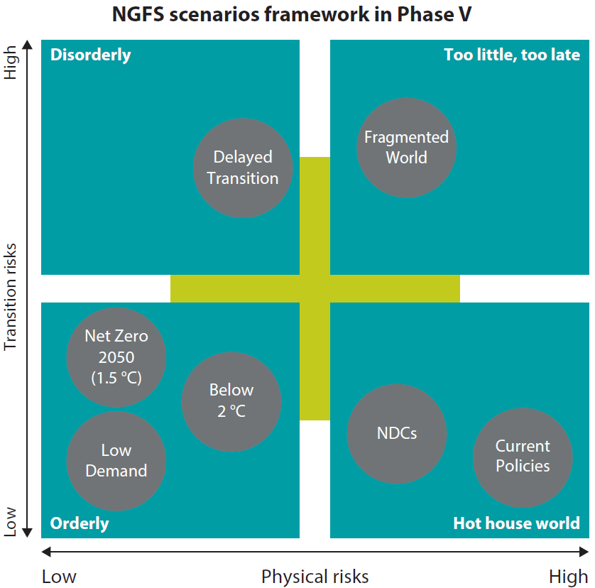 Developed by central banks and supervisors, NGFS scenarios model how climate risks could impact the economy under varying assumptions about policy action, technology, and physical risks.